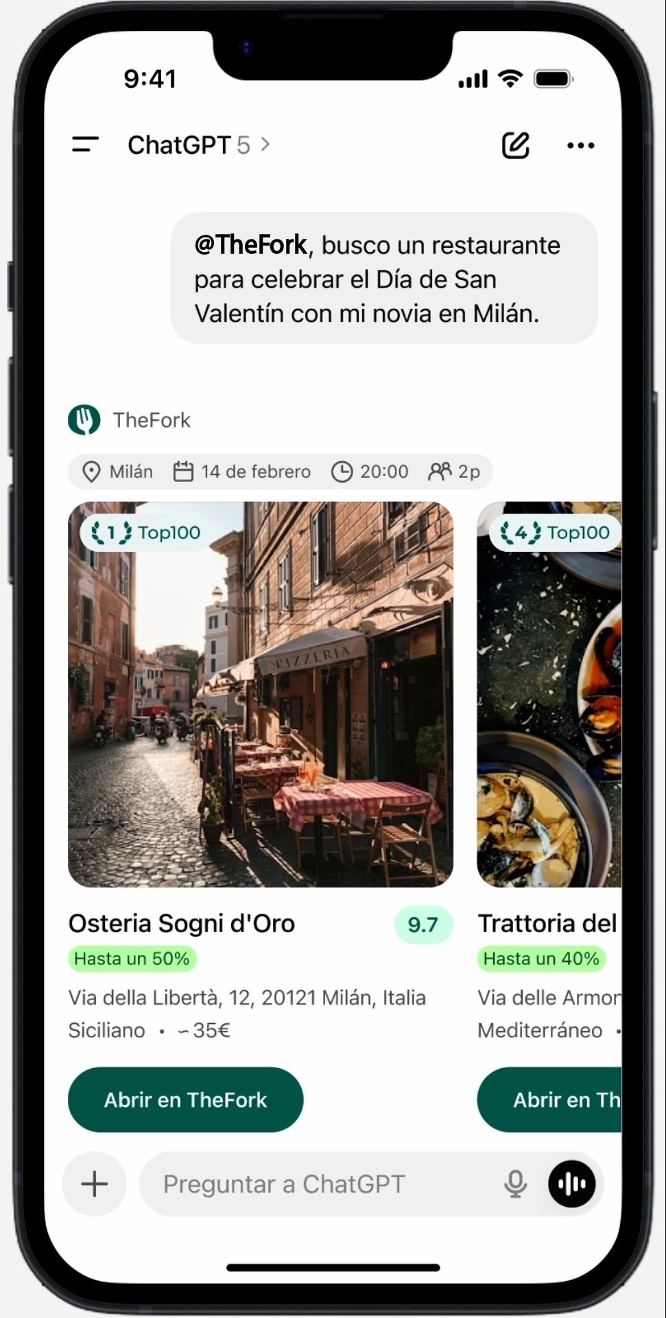 Gracias a este acuerdo, los comensales van a poder hablar directamente con ChatGPT para descubrir y preguntar por restaurantes en tiempo real y reservar a través de la plataforma. Como respuesta, la IA mostrará directamente la aplicación de TheFork, con una selección de restaurantes disponibles en la plataforma, incluyendo fotos, valoraciones, ofertas especiales y disponibilidad, con el objetivo de que reservar mesa lleve solo unos segundos.