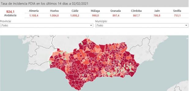 Andalucía en su conjunto ha rebajado durante las últimas 24 horas su tasa de incidencia de casos de Covid-19 por cada 100.000 habitantes en los últimos 14 días hasta 924,1, 28,1 puntos más que la registrada el lunes (952,2), pero superior a la del viernes de 891,2 –el fin de semana no se actualiza–.