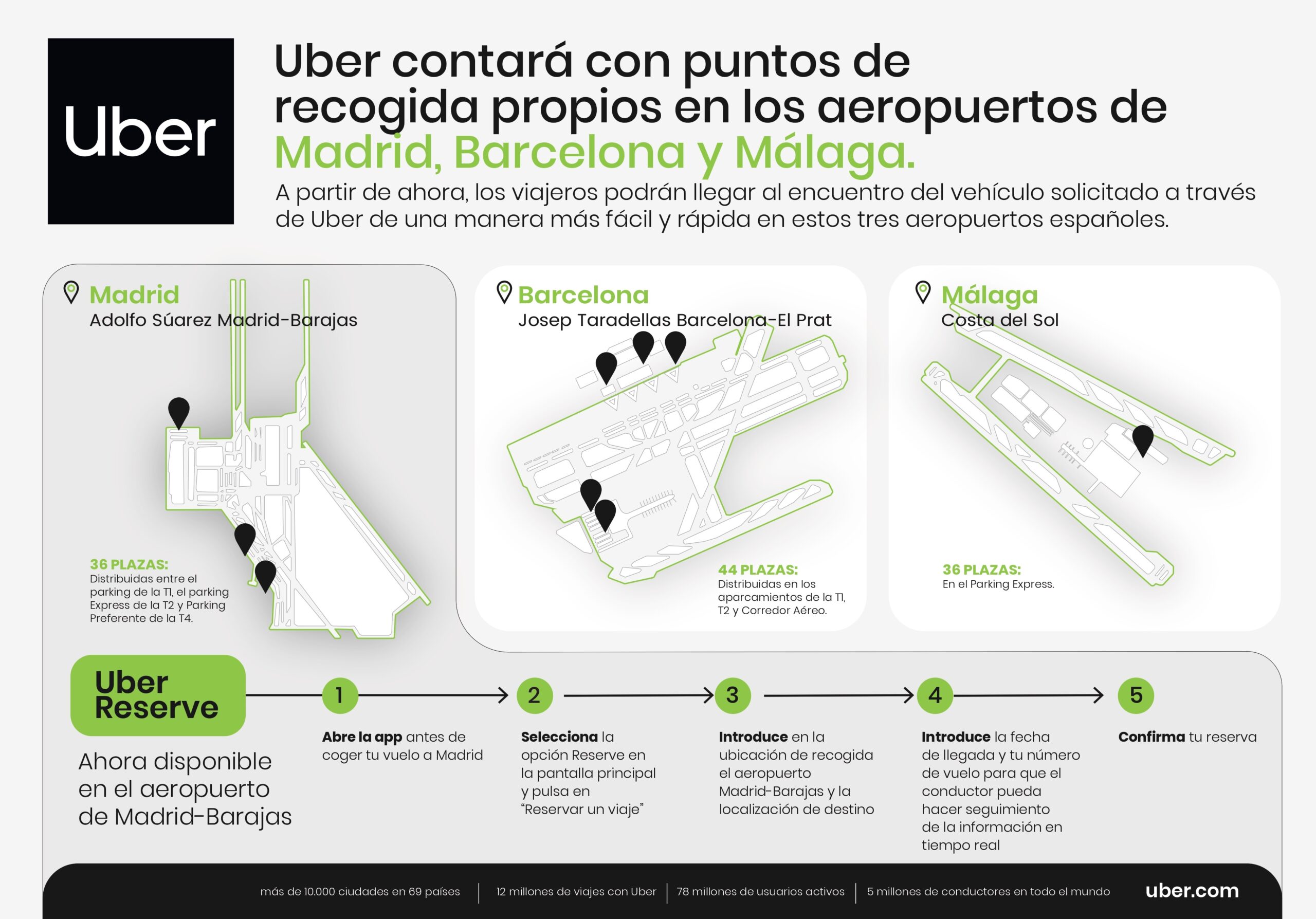 En Barcelona, Uber contará con 44 plazas distribuidas en los aparcamientos de la T1, T2 y corredor aéreo. En Madrid, habrá 36 plazas distribuidas entre el aparcamiento de la T1, el aparcamiento express de la T2, y el preferente de la T4, mientras que en Málaga, la compañía tendrá 36 plazas en el aparcamiento express.