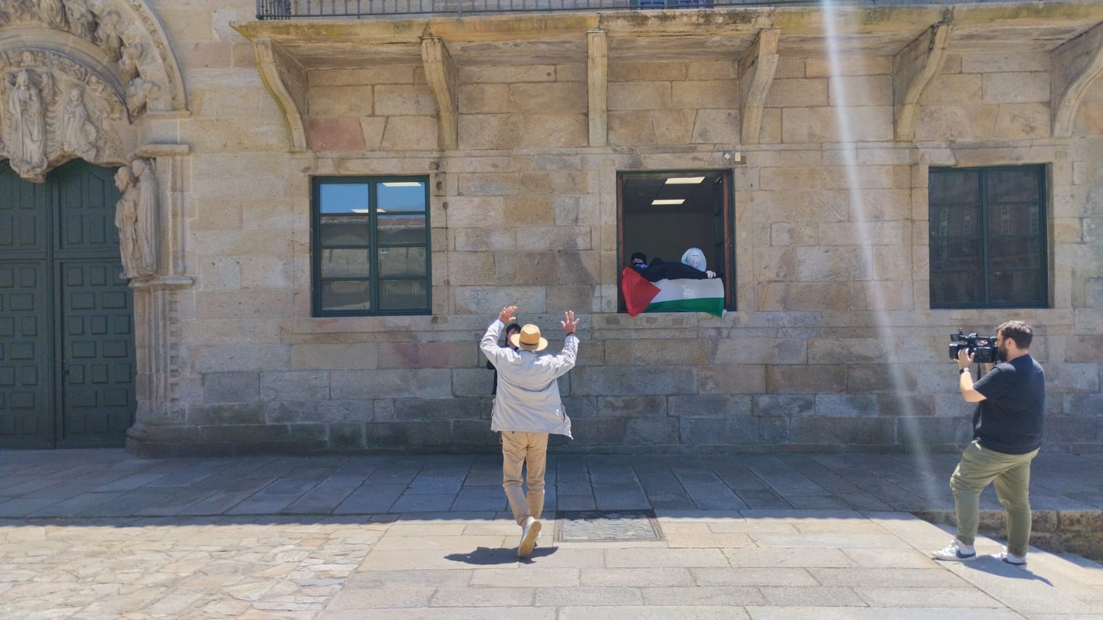 La acción se ha producido en el momento en el que la USC celebra su consejo de gobierno, al que los acampados en Historia reclamaron la pasada semana que «rompiese» relaciones con entidades «vinculados» al «estado sionista» y abandonase su posición «tibia» sobre el conflicto en Gaza.