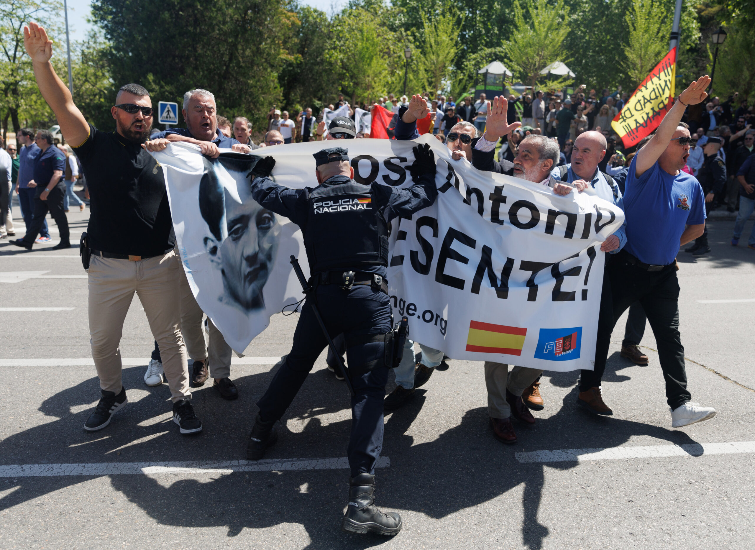 Los seguidores de José Antonio Primo de Rivera se encontraban en la acera frente al cementerio, pero han logrado muy fácilmente romper la barrera policial desplegada para dicho efecto.