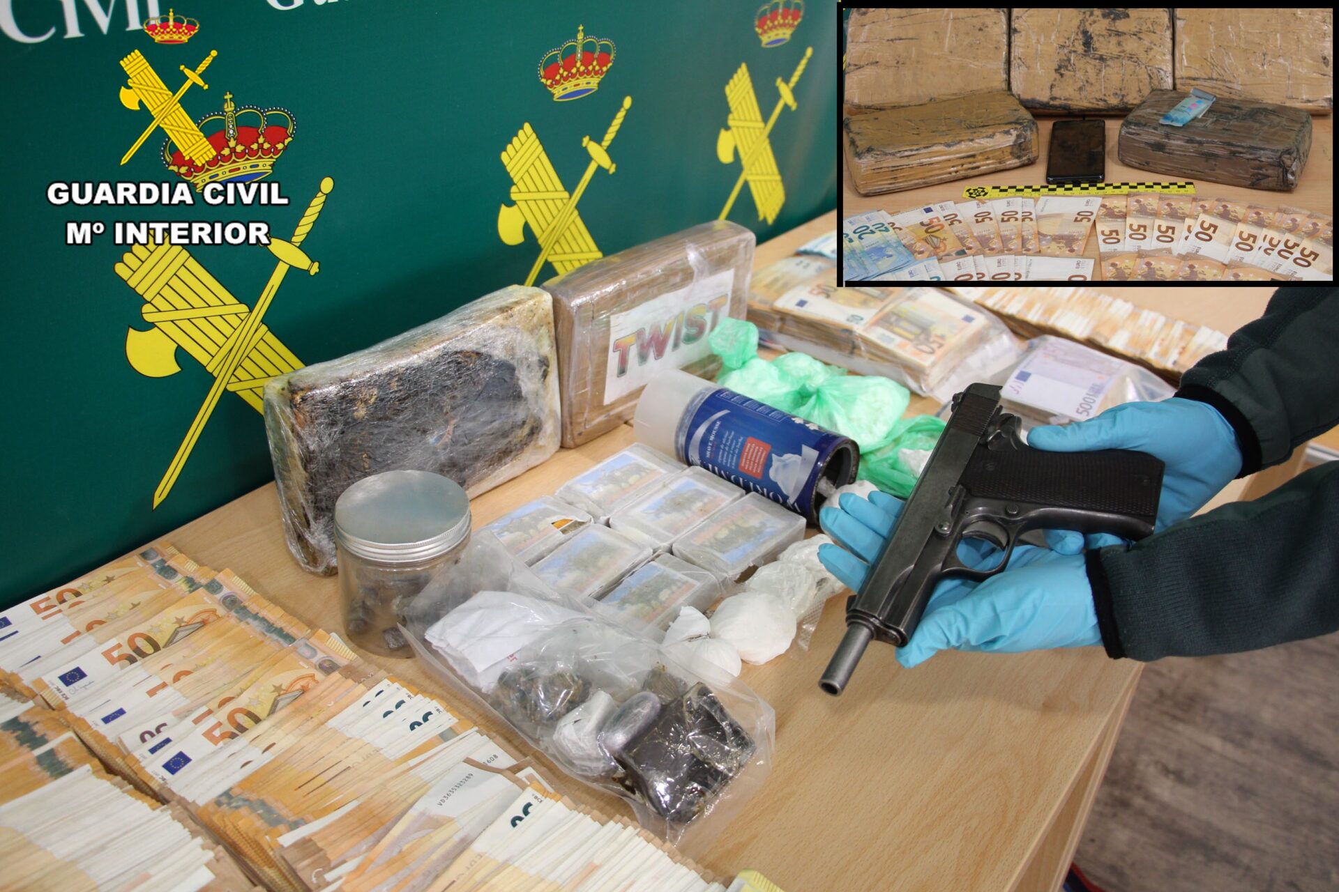 La operación Tiberio se ha cerrado con un balance de 7,5 kilos de cocaína y un kilo de cannabis incautados, la intervención de 135.000 euros, el desmantelamiento de una plantación «indoor» de marihuana en una vivienda de Leganés con 109 plantas, un arma corta de fuego, munición y otro tipo de armas prohibidas, así como utensilios para la práctica del corte de droga previo a su comercialización.