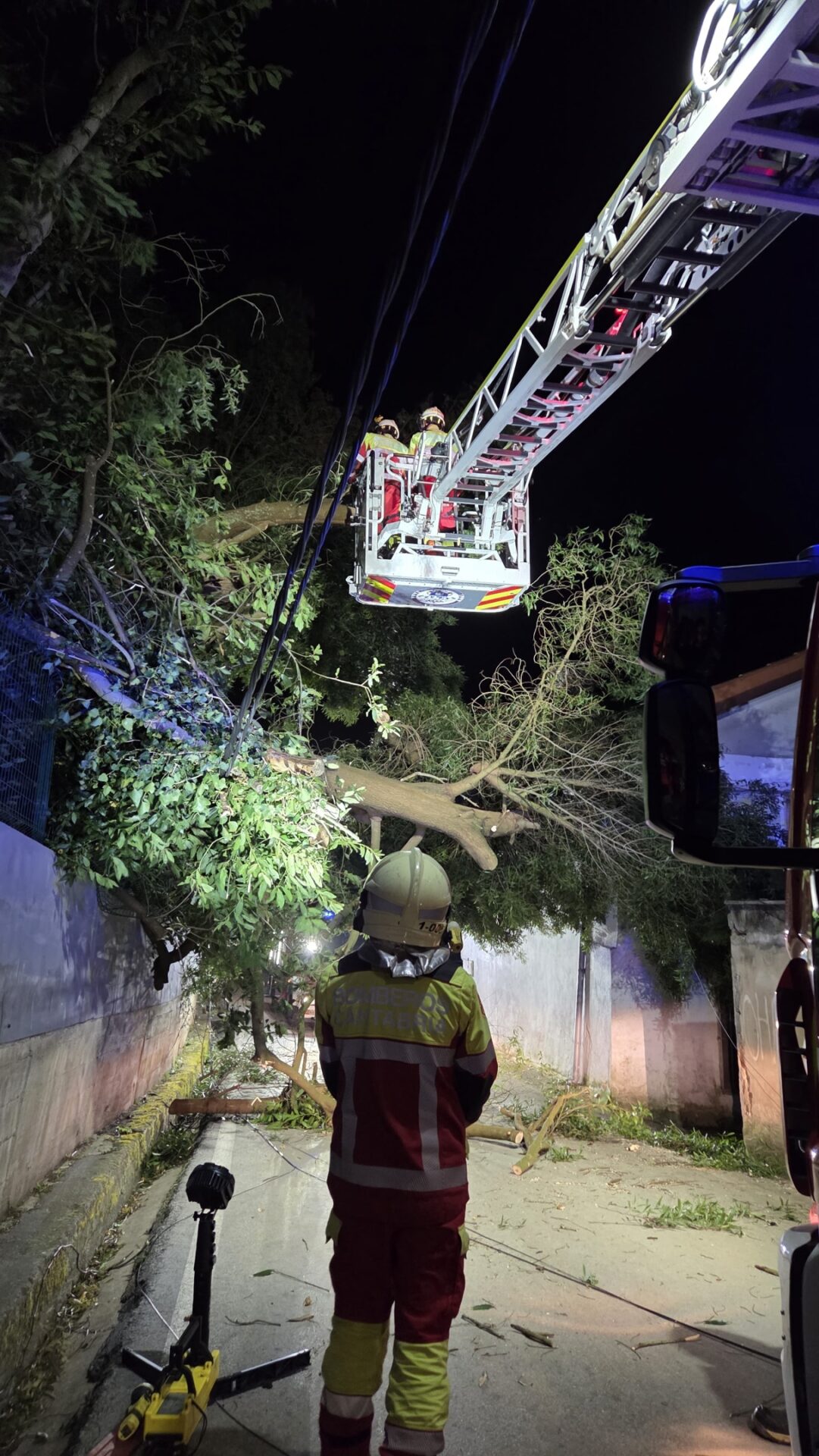Los Bomberos del Gobierno de Cantabria tuvieron que cortar el árbol para abrir el acceso a la vía y aseguraron el tendido eléctrico y el cableado de fibra descolgado.