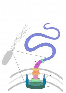 El desplazamiento se convierte así en una condición esencial para la supervivencia de determinadas bacterias y, para ello, necesitan disponer de una estructura imprescindible, el flagelo, una perfecta y pequeña máquina molecular compuesta de varias partes que interactúan y contribuyen a la función básica, donde eliminar alguna de ellas interrumpiría las funciones de ese sistema.