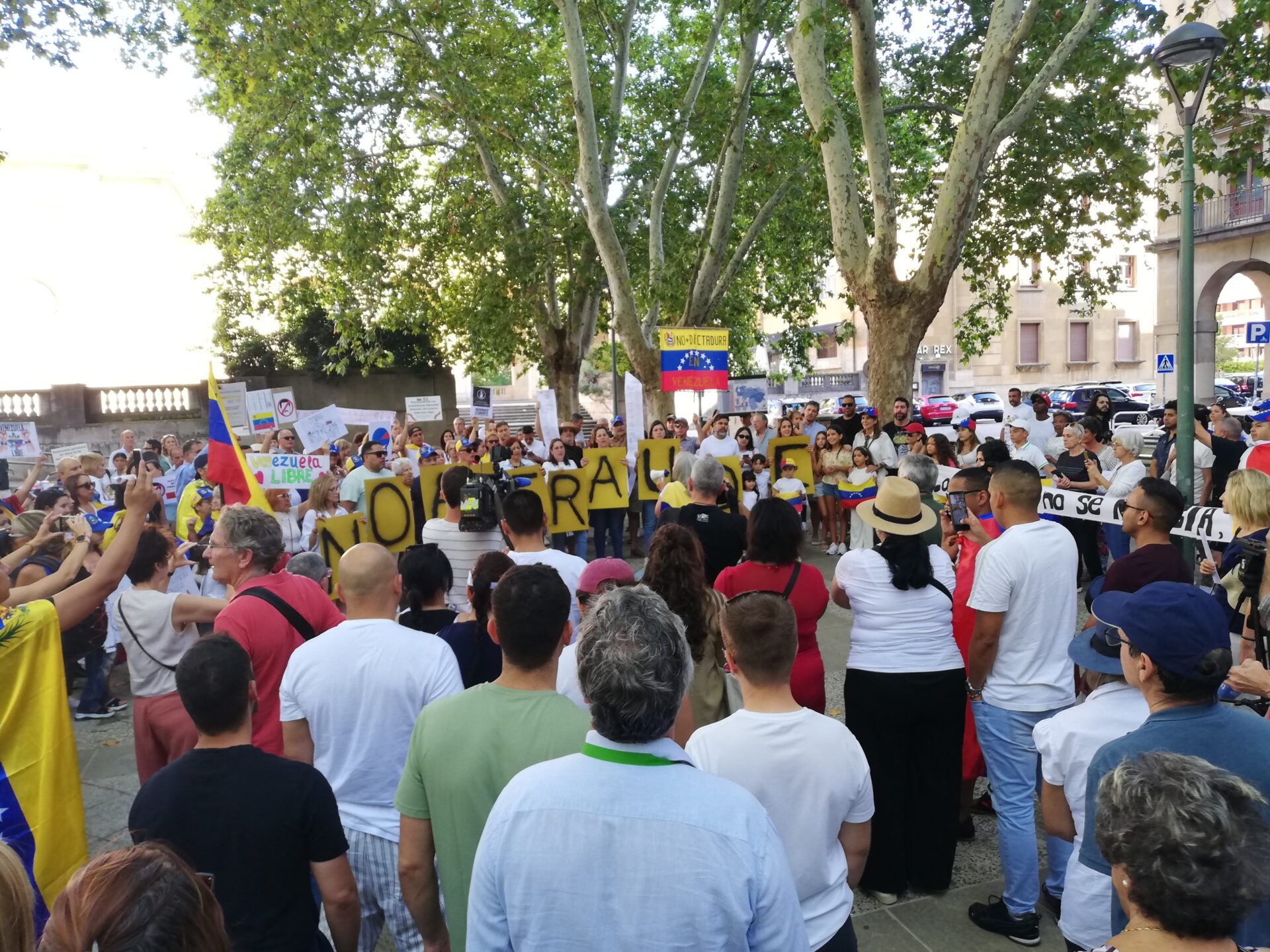 Un grupo de manifestantes, portando cada uno una letra, ha formado la frase No al fraude . Además, se han visto carteles con mensajes como Fuera Maduro , Maduro dictador , Venezuela libre o Yo soy venezolana y mi presidente es Edmundo González . También se han coreado consignas como Venezuela ya votó. Venezuela ya eligió .