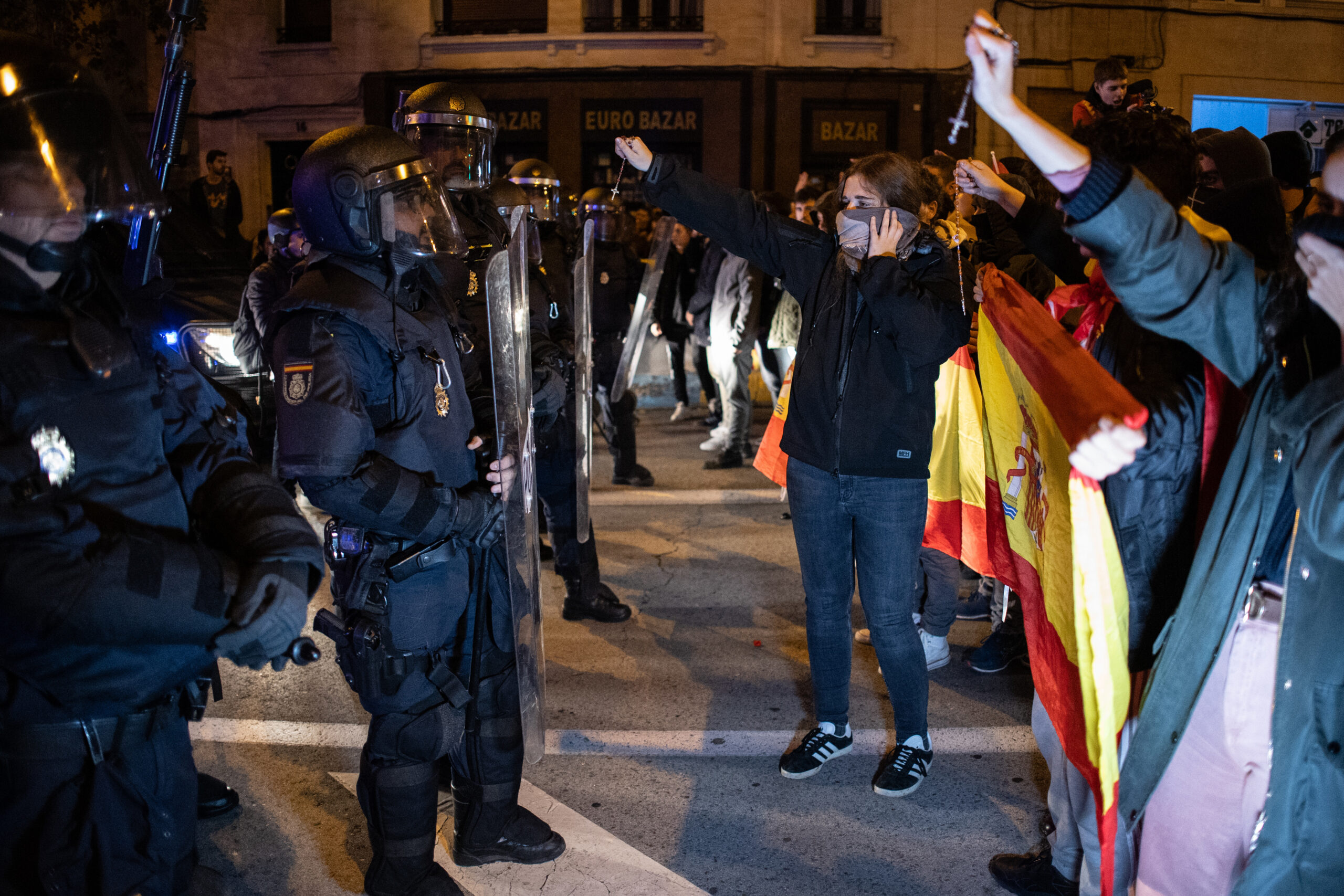 Posteriormente, los antidisturbios han comenzado a dispersar por Ferraz y Marqués de Urquijo, pero un grupo reducido continuaba en la zona, algunos con saludos y proclamas fascistas, mientras desafiaban con la mirada a los agentes policiales que se encontraban en posición previa a cargar. Ese escudo lo he pagado yo o El 1 de octubre yo te defendí eran otros de los cánticos que gritaban dirigiéndose a la Policía.