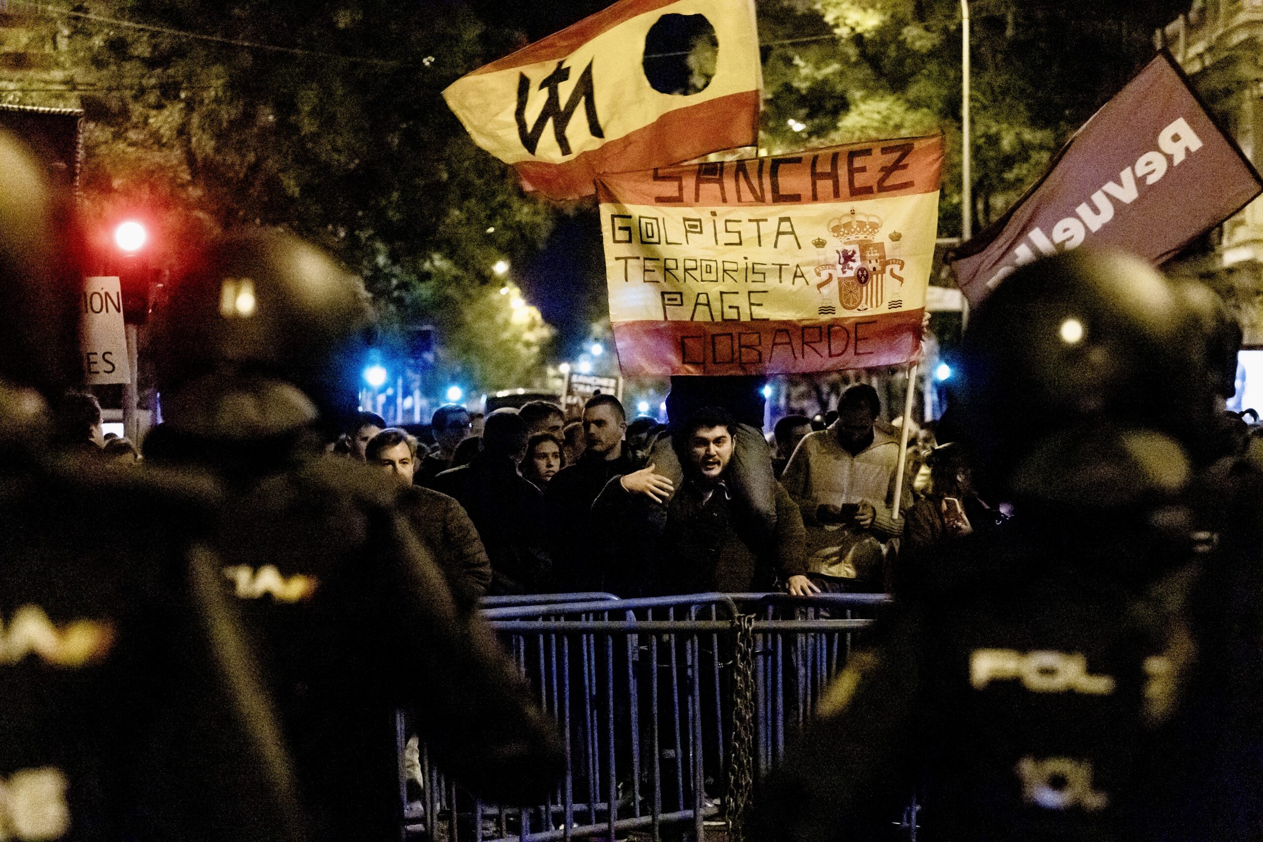 Los concentrados en Ferraz portaban banderas de España, banderas carlistas y algunas franquistas y han cantado en reiteradas ocasiones el Cara al Sol , además de reivindicar la figura de José Antonio Primo de Rivera. También se han escuchado cánticos en contra de Sánchez y del Gobierno, al que han calificado de «gobierno golpista» y «España no se vende, España se defiende», y en contra de Puigdemont.