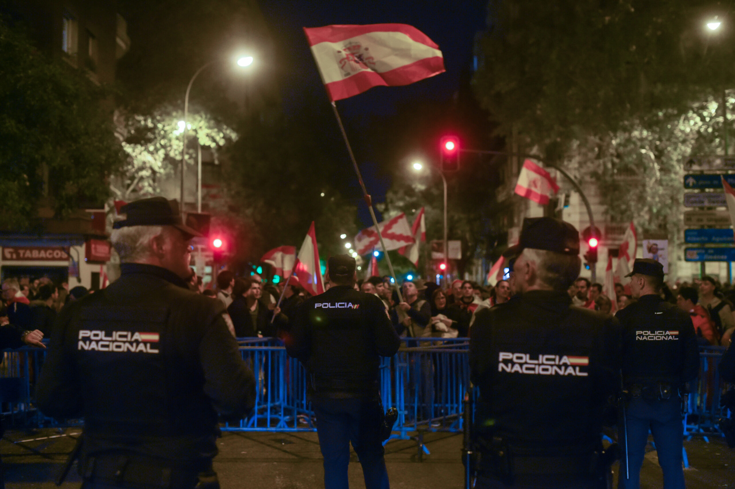 Los manifestantes, frenados por un cordón policial en la esquina de Ferraz con Marqués de Urquijo, han protestado una noche más portando banderas de España, además de varias franquistas y una en la que se podía leer La Constitución destruye la nación , mientras otros han defendido la Carta Magna.