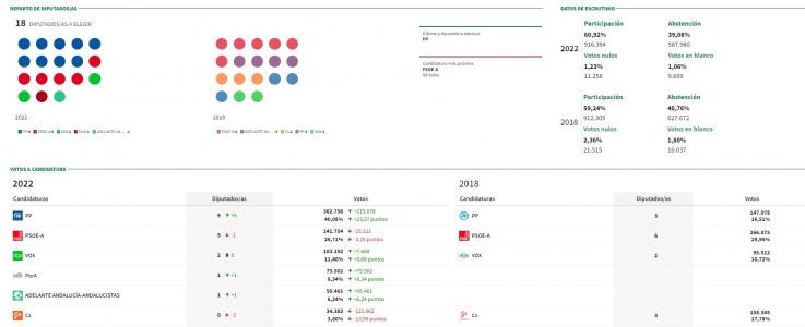 En la provincia, con el 98,88% escrutado, el PP logra nueve escaños por cinco del PSOE, dos de Vox, uno de Por Andalucía y otro de Adelante Andalucía