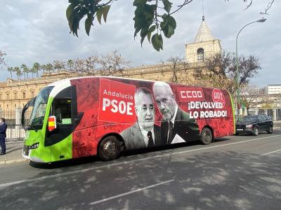 Así lo ha explicado el portavoz de Vox en el Parlamento andaluz, Manuel Gavira, que ha hecho la presentación de esta campaña a las puertas de la sede de UGT-A en Sevilla, hasta donde han desplazado un autobús en el que aparecen las caras de los expresidentes de la Junta Manuel Chaves y José Antonio Griñán. Con motivo de esta presencia de Vox ante su sede, el sindicato ha decidido emitir a través de altavoces la Internacional Socialista.