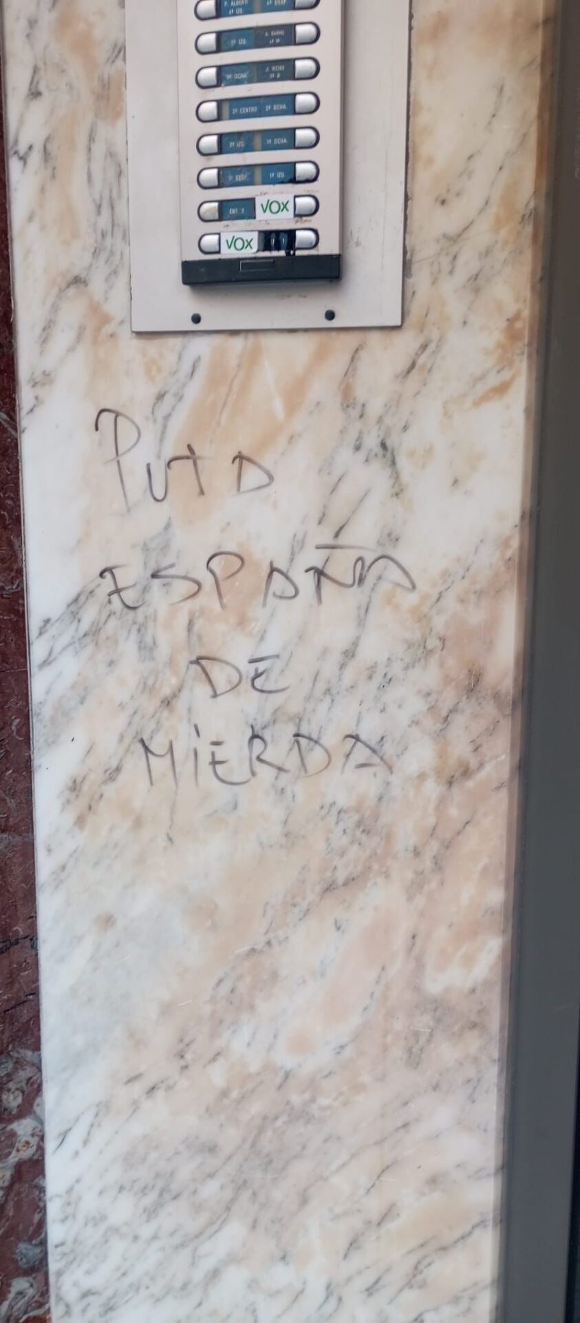 El mensaje, «Puta España de mierda», ha sido escrito junto al telefonillo de la entrada al edificio, según una imagen remitida por el partido.