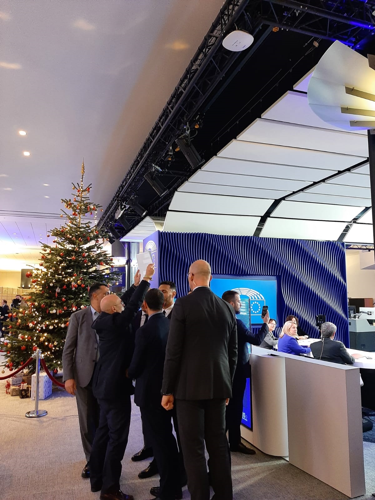 Posteriormente el eurodiputado de Vox ha vuelto a entrar en escena, esta vez con carteles que rezaban Maria Corina no puede entrar en el Parlamento Europeo pero el asesor de Maduro sí , en denuncia a que la ganadora del premio Sajarov no podrá recoger el galardón la próxima semana en Estrasburgo. En ese punto, se ha unido Buxadé quien ha intentado mostrar los carteles en las imágenes que se grababan en el estudio aledaño, todo frente a la oposición de una decena de agentes de seguridad de la institución que bloqueaban sus movimientos.