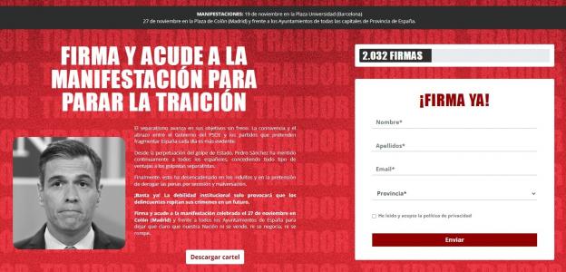 A la vez, el partido liderado por Santiago Abascal ha iniciado una recogida de firmas –en una web llamada sanchezveteya.es –. «Firma y acude a la manifestación para parar la traición», anima a sus afiliados y simpatizantes.