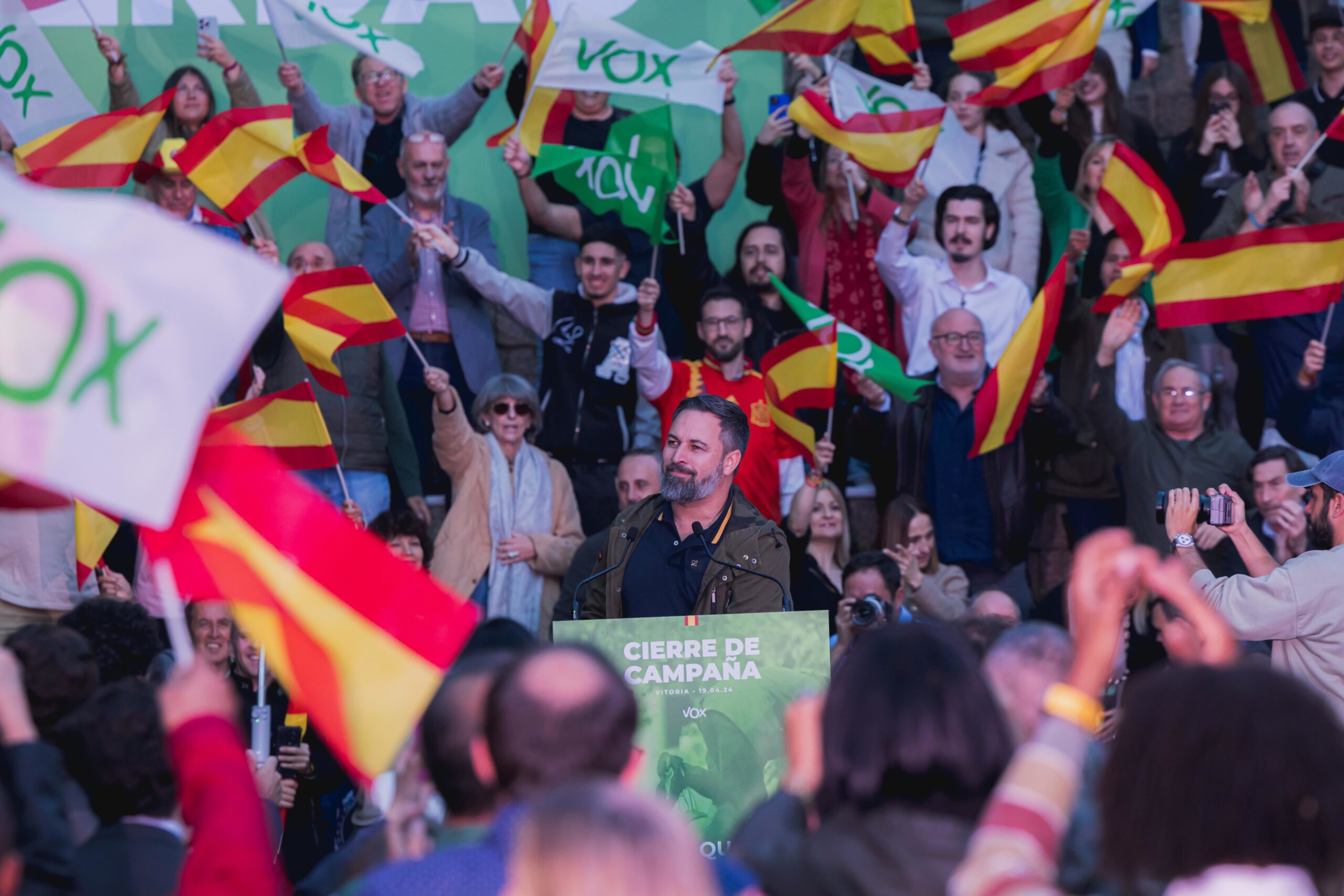 Vox ha celebrado en la plaza de los Fueros de Vitoria-Gasteiz el acto de cierre de campaña, en el que Abascal ha estado acompañado por el secretario general del partido, Ignacio Garriga; y los candidatos de Vox por Álava, Bizkaia y Gipuzkoa.